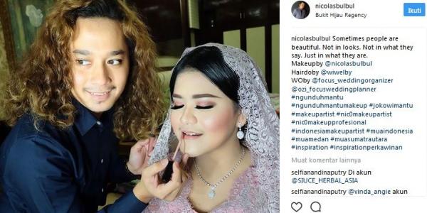 Foto-foto close up wajah Kahiyang Ayu diunggah di akun perias asal Medan, Nico Samosir (@nicolasbulbul). "Our beautiful bride Ms.khahiyang, it's an honour to brushed her on her ‘mangalehen marga to boru na di oli’ day in Medan," tulis Nico dalam keterangan fotonya tersebut.
