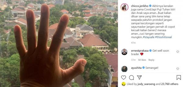 “Buat kalian diluar sana yang blm kena tetap waspada patuhin protokol jangan sampai kecolongan seperti saya, masker jangan pernah di copot kecuali kalian bener2 merasa aman...cuci tangan sesering mungkin,” tulis Chicco memberi pesan.