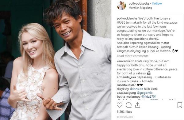 Merasa terkesan dengan keramahan dan kebaikan, Polly pun membalas dengan mengucapkan terima kasih. Dalam akun Instagramnya, @pollyoddsocks menuliskan dengan menggunakan tiga bahasa, Indonesia, Inggris dan Jawa.