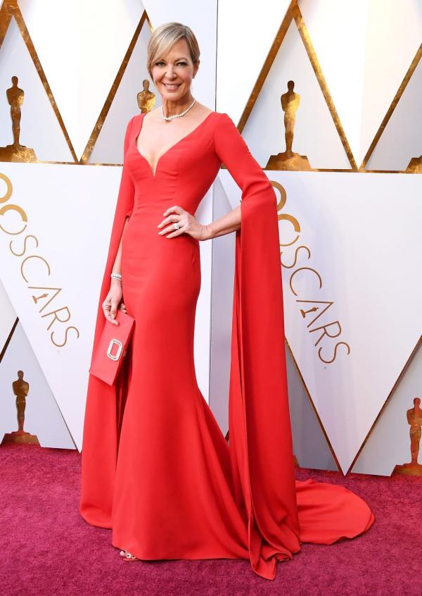 Janney yang berhasil menyabet piala Oscar untuk nominasi Best Supporting Actress, mengenakan gaun merah dari Reem Acra. Gaun ini membuatnya terlihat memukaudi perhelatan Academy Awards.