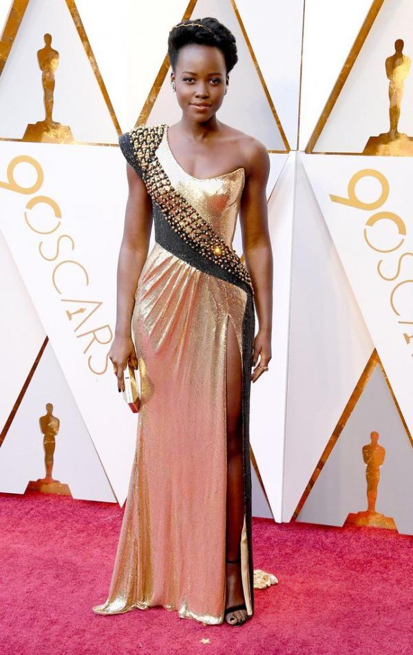 Mengenakan gaun Versace 'vibranium' berwarna emas berbelahan paha tinggi, Nyong'o tampil memesona di ajang Oscar 2018. Ditambah sepatu Alexandre Birman dan perhiasan dari Niwaka, pemeran Nakia dalam film 'The Black Panther' sukses mencuri perhatian.