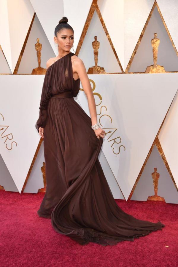 Mengenakan gaun dari Giambattista Valli Haute Couture, Zendaya tampil elegan di red carpet Oscar 2018. Dia menyempurnakan penampilannya dengan heels dari Brian Atwood dan perhiasan dari Bulgari.