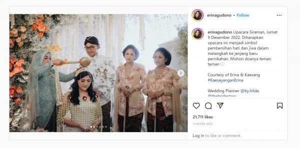 Pada prosesi siraman, Erina mengenakan kain putih polos yang diselimuti ronce melati. Tak ada desainer yang terlibat di prosesi adat Jawa ini. Tim yang berjasa dalam prosesi ini mencakup penata rambut by Noe Hair and Makeup dan penata rias dari Hepi David. Aura Erina benar-benar terpancar di sini.