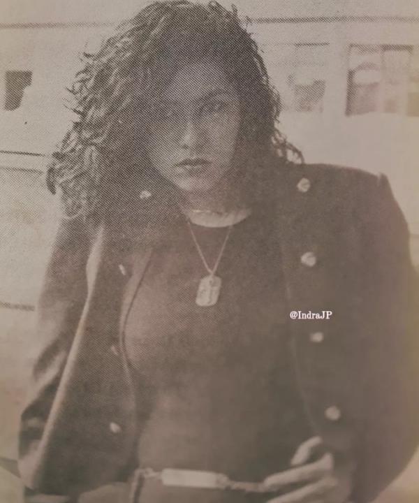 Seperti di foto ini saat dia menjadi model. Dia memakai inner yang dipadu padankan dengan blazer dan aksesori kalung. Tampilan rambutnya dibuat keriting yang hits pada zamannya.