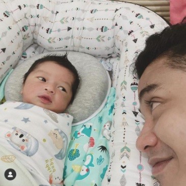 Momen gemas lainnya terjadi ketika Adly menemani baby Ardashir di tempat tidur. Di foto itu, tampak aktor 33 tahun ini menatap buah hatinya. Gemasnya, baby Ardashir pun memberikan lirikan yang lucu.