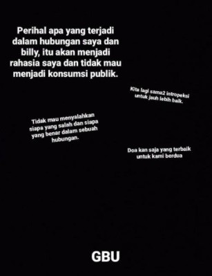 Dia hanya meminta doa untuknya dan Billy pada para pengikutnya. “Doakan saja yang terbaik untuk kami berdua. GBU,” tulis perempuan berdarah Spanyol dan Manado ini.