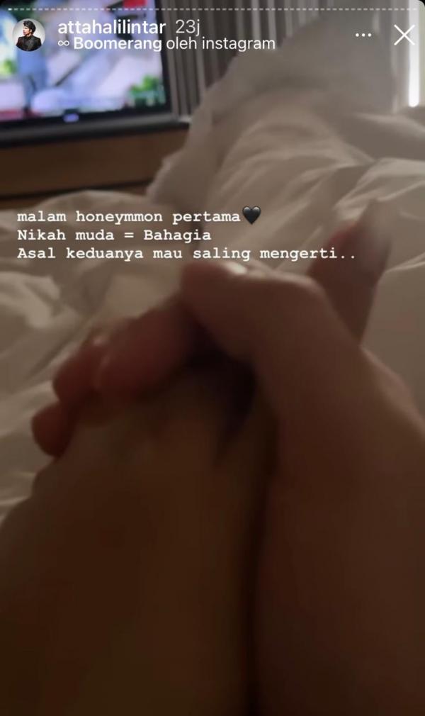 “Malam honeymoon pertama. Nikah muda = bahagia. Asal keduanya mau saling mengerti,” tulis Atta Halilintar di Instagram Story-nya.