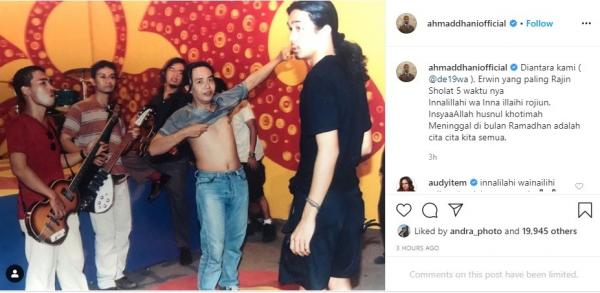 Di media sosial Instagram, Ahmad Dhani mengunggah foto kebersamaan para personel Dewa 19 formasi awal. Dalam unggahanya itu, dia juga menyertakan caption atas meninggalnya sang sahabat.