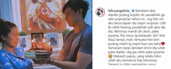 “Semalem abis dianter pulang kupikir ah yaudahlah ga ada surprise-surprise-an tahun ini.. orang Hito sama aku terus, kapan dia siapin surprise. Udah 8 kali ultah bareng, yaudahlah udah abis ide dia,” tulis Felicya seperti dikutip dari Instagramnya, Senin (2/11/2020).