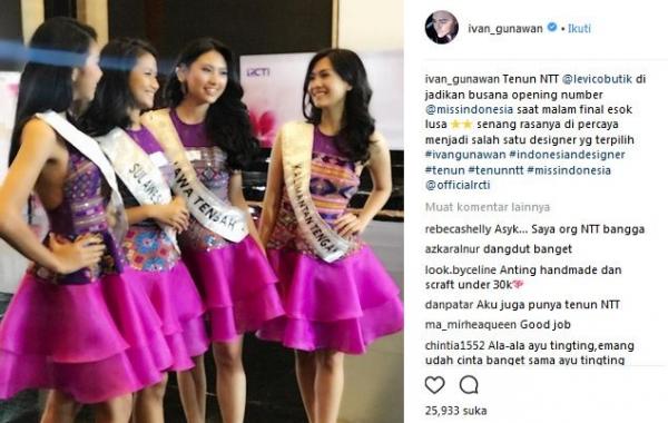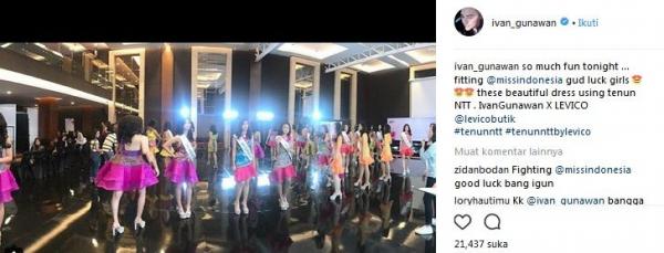 “So much fun tonight fitting @missindonesia gud luck girls. These beautiful dress using tenun NTT. Ivan Gunawan x Levico @levicobutik #tenunntt #tenunnttbylevico,” tulis pria yang berprofesi sebagai presenter kondang itu.