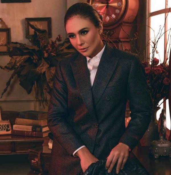 Beda dengan penampilan pertama yang girly dengan dress putihnya, di foto ini Wulan Guritno tampak kece dengan setelan kemeja putih dan jas wanita berwarna gelap.