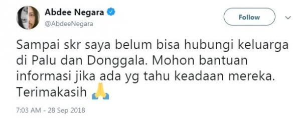 "Sampai skr saya belum bisa hubungi keluarga di Palu dan Donggala. Mohon bantuan informasi jika ada yg tahu keadaan mereka. Terimakasih," tulisnya seperti dikutip iNews.id dari twitter @AbdeeNegara yang diunggah Jumat (28/9).