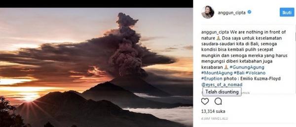 Di dalam foto tersebut, terlihat erupsi magmatik Gunung Agung. Sejumlah netizen pun lantas mengamini doa Anggun dan turut mendoakan keselamatan warga Bali.