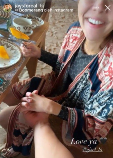 Di unggahannya itu, tampak Gisel sedang mencium tangan Wijin di tengah mereka menikmati sarapan paginya di Sumba.