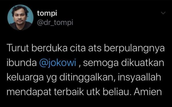 “Turut berduka cita ats berpulangnya ibunda @jokowi, semoga dikuatkan keluarga yg ditinggalkan, insyaallah mendapat terbaik utk beliau. Amien,” tulis penyanyi Tompi, seperti dikutip dari media sosial Twitternya, Rabu (25/3/2020).
