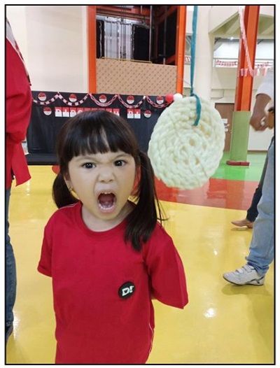 Merasa kesal kerupuknya tak bisa digigit dia sempat memegangi tali agar tidak goyang. Dia juga sempat memunggungi kerupuknya agar tak tetap stabil.