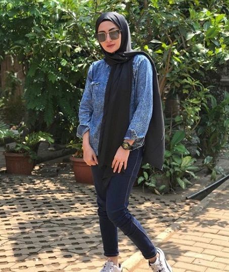 Dalam gaya ini, istri dari Abdullah Rizal tampak trendi dan muda lewat paduan jaket dan celana jeans warna gelap yang dipadankan dengan hijab pashmina hitam. Agar tampil kasual dan sporty, Natalie Sarah melengkapi gayanya dengan sepatu kets hitam-putih.
