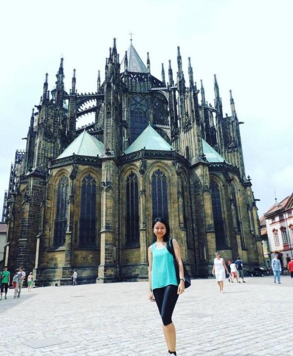 Berbeda jauh dari gaya mewahnya dalam balutan gaun bangsawan Eropa, di foto ini Irene tampak santai mengenakan kaus tanpa lengan berwarna toska yang dipadankan dengan celana selutut dan sepasang sepatu sneakers. “Judulnya, Suatu Hari di Kota Praha,” tulisnya.