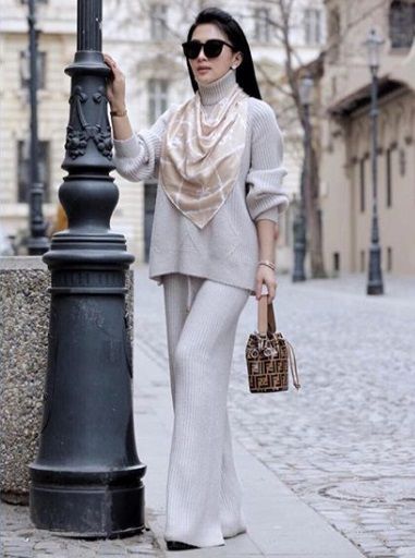 Bagi Anda yang suka mengenakan fashion item berbahan rajut, mungkin bisa mencontek gaya Syahrini yang satu ini. Kali ini, dia memadukan atasan sweater krem abu-abu dan celana longgar dengan tone warna dan bahan yang hampir sama. Agar tak tampak polos, dia memadukannya dengan scarf bermotif, serta tas mungil dari Fendi seharga Rp22,7 juta.