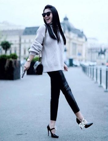 Fashion item berbahan rajut seperti sweater memang masuk digabungkan dengan fashion item berbahan lain seperti jeans atau kulit. Lihat saja gaya Syahrini yang cantik memadukan sweaternya dengan legging hitam berbahan kulit tersebut. Agar lebih sempurna, gaya itu dia padukan dengan high heels hitam dari Gucci seharga Rp20 juta dan tas Chanel yang dibanderol Rp73,1 juta.