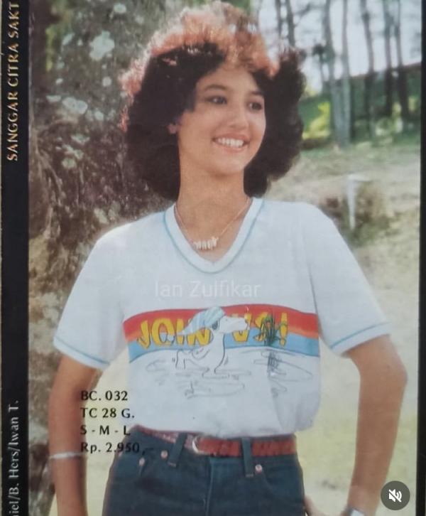 Sejak era tahun 1980-an sampai sekarang, nama Meriam Bellina begitu dikenal oleh publik. Dia aktif menjadi aktris film maupun bintang iklan. Salah satunya adalah model kaos Bee Collection di tahun 1980 seperti dalam potret lawas satu ini.