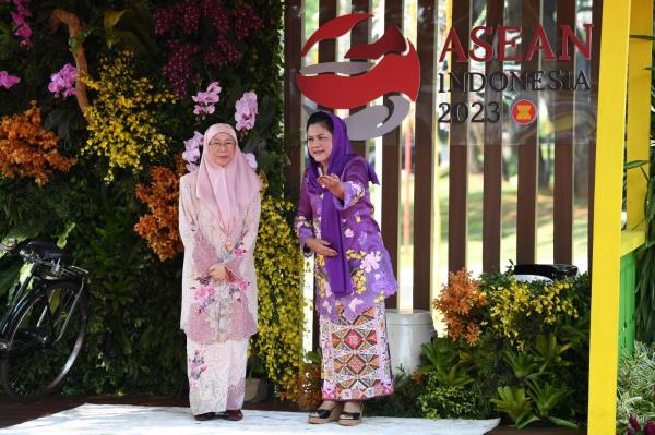 Di potret ini, Iriana Jokowi terlihat memesona memamerkan senyum menis ke arah kamera sambil berfoto dengan latar bertuliskan ‘ASEAN Indonesia 2023’. Iriana juga menambahkan aksesori cincin.