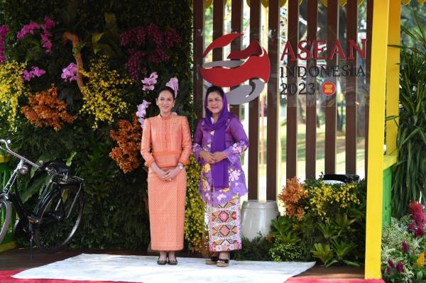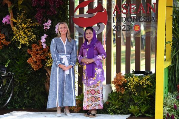 Di potret terakhir ini memperlihatkan kebersamaan Iriana dengan istri Perdana Menteri Kamboja, Pich Chanmonya. Keduanya tampak senyum ke arah kamera. Pich Chanmonya memakai satu set outfit yang terdiri dari atasan lengan panjang dan rok warna peach.