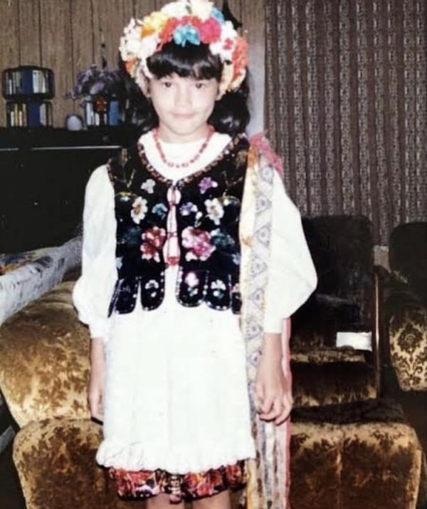 Dia terlihat cantik dengan dress aksen motif yang digunakannya. Dia juga tampil heboh dengan hiasan bando bunga di kepalanya. Paras cantik ibu dua anak ini sudah terpancar sejak dulu.