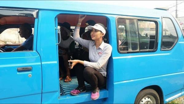 Potret artis Glenca Chysara naik angkot ini terbilang agak unik. Sambil berdiri di pintu angkot layaknya kenek, Glenca justru mengenakan kebaya lengkap dengan kain batik coklat khas budaya Jawa!