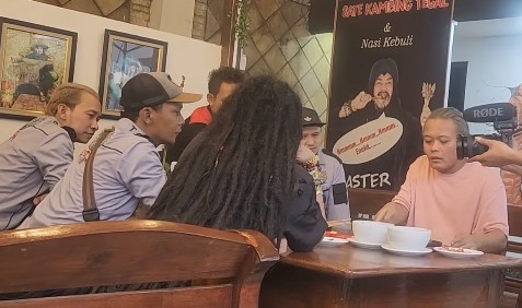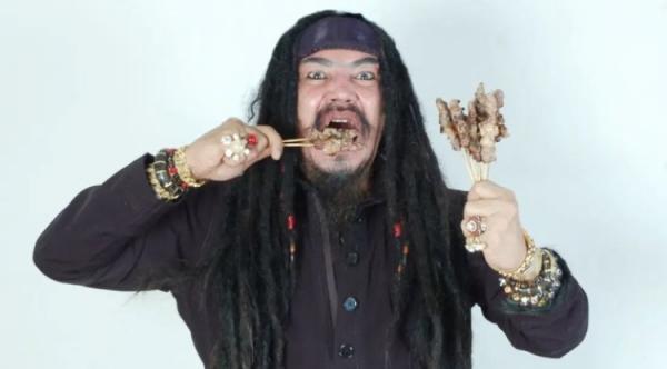 Selanjutnya yakni potret Limbad berpose sambil menyantap sate langsung dua tusuk. Sementara itu tangan di sebelahnya memegang banyak tusuk sate. Masih dengan gaya khasnya, di foto itu Limbad memakai baju serba hitam dengan rambut gimbal dan beberapa aksesori.