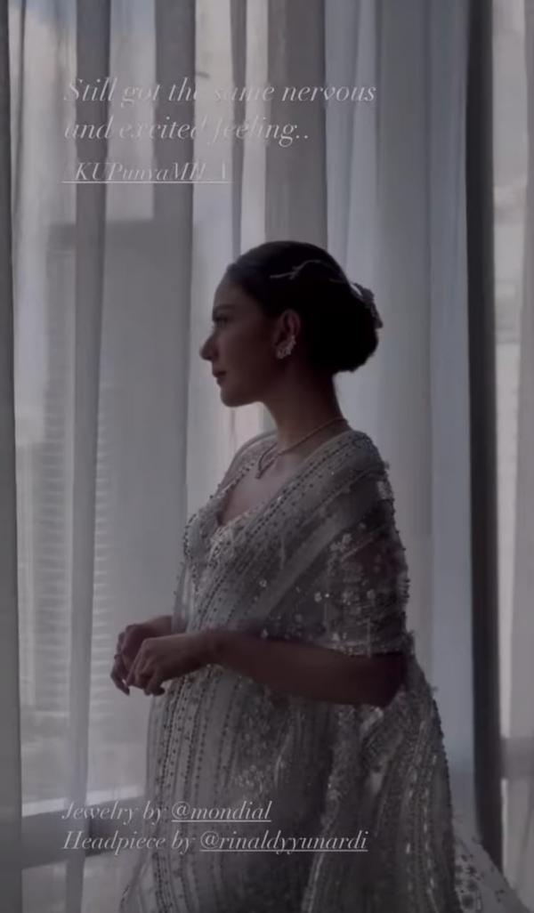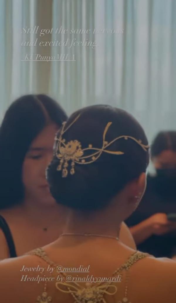 Dress tersebut satu set dengan selendangnya yang membuat penampilan sang aktris semakin anggun dan memesona. Tampilan rambut Jessica Mila juga disanggul dan dihiasi headpiece karya desainer Rinaldy Yunardi.