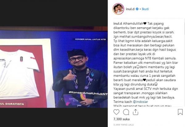 "Alhamdulillah, tak pajang di kantorku biar semangat kerjaku ngggak berhenti, biar dapat prestasi kayak si Sarah. Jangan melihat sumbangsihnya, besar atau kecil, tapi lihat bagaimana kita adalah keluarga, sakit bisa ikut merasakan dan berbagi pelukan dalam kesedihan. Kerja keras dengan hasil bagus dan berprestasi layak untuk diapresiasikan, semoga NTB Kembali semula," tulis Inul seperti iNews.id kutip dari Instagram miliknya, Kamis (30/8/2018).