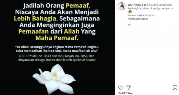 Di postingan terbarunya, Rizki juga mengunggah gambar yang menuliskan hadis tentang menjadi seseorang pemaaf.