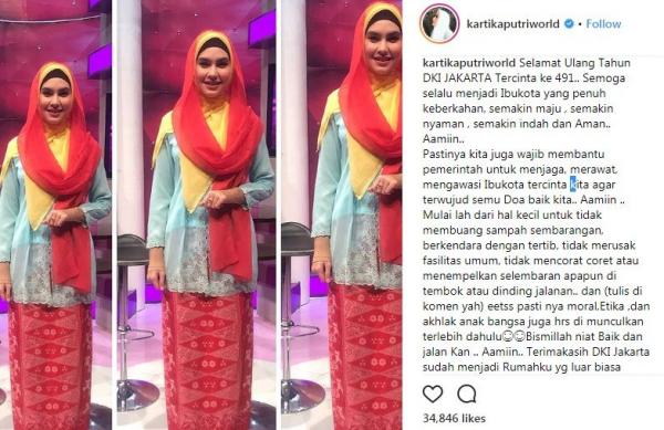 "Pastinya kita juga wajib membantu pemerintah untuk menjaga, merawat, mengawasi Ibukota tercinta kita agar terwujud semu Doa baik kita.. Aamiin .. Mulai lah dari hal kecil untuk tidak membuang sampah sembarangan, berkendara dengan tertib, tidak merusak fasilitas umum, tidak mencorat coret atau menempelkan selembaran apapun di tembok atau dinding jalanan.. dan (tulis di komen yah)," tulis Kartika di akun Instagram miliknya, Jumat (22/6/2018).