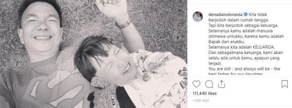 "Kita tidak berjodoh dalam rumah tangga, tapi kita berjodoh sebagai keluarga. Selamanya kamu adalah manusia istimewa untukku, karena kamu adalah Bapak dari anakku. Selamanya kita adalah KELUARGA," tulis Denada, seperti dikutip dari keterangan foto Instagram miliknya, Senin (1/7/2019).