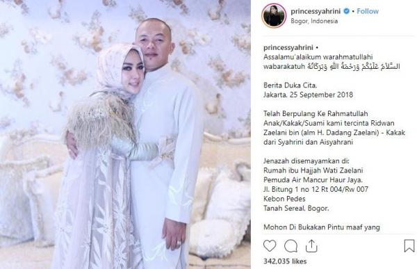 Syahrini merasa terpukul dengan kabar ini, terlebih kakaknya akan menjadi wali nikahnya nanti. Dalam unggahan Instagram miliknya, dia meminta agar almarhum dimaafkan dan didoakan agar amal ibadahnya diterima di sisi-Nya.