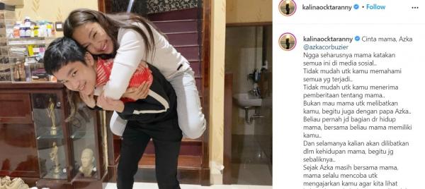 “Dear Mom, @kalinaocktaranny, karena media terus bertanya tentangmu dan hubungan barumu, aku yakin aku harus mengatakan ini. Bu, aku tidak membencimu atas apa yang kamu lakukan,” tulis Azka seperti dikutip dari Instagramnya, Selasa (24/11/2020).