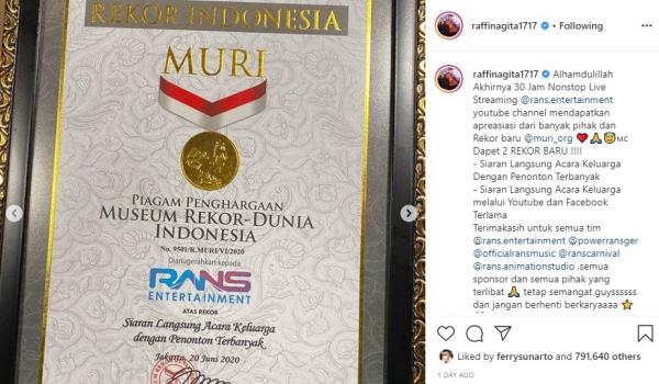 "Alhamdulillah Akhirnya 30 Jam Nonstop Live Streaming @rans.entertainment youtube channel mendapatkan apreasiasi dari banyak pihak dan Rekor baru @muri_org. Dapet dua rekor baru," tulis Raffi dan Nagita dalam keterangan unggahannya, dikutip Senin (22/6/2020).