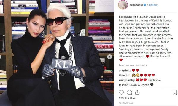 "Saya kehilangan kata-kata dan begitu hancur oleh kehilangan Karl. Humor, kecerdasan, cinta, dan hasratnya akan fashion terus hidup selamanya. Terima kasih atas inspirasi yang Anda berikan kepada dunia ini dan semua hati yang Anda sentuh dalam prosesnya," tulis Bella di Instagram miliknya.