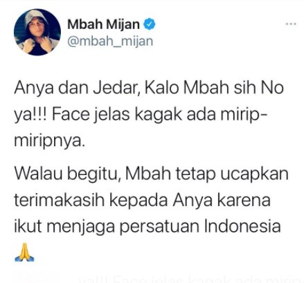 “Anya dan Jedar, Kalo Mbah sih No ya!!! Face jelas kagak ada mirip-miripnya,” tulis Mbah Mijan melalui akun Twitternya, Senin (9/11/2020).