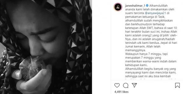 “Alhamdulillah ananda kami telah dimakamkan oleh suami tercinta @arsyawijaya21 di pemakaman keluarga di Tasik, alhamdulillah sudah mengikhlaskan dan berkhuznudzon terhadap ketetapan Allah SWT, bahwa di saat 10 hari terakhir bulan suci ini, inshaa Allah kami adalah orang-orang yang di'pilih' oleh-Nya,” tulis Jane.