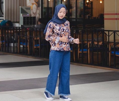 Nah, kalau gaya satu ini bakal cocok bagi kamu penggemar denim maupun senang koleksi fashion item warna-warna navy. Kali ini, Nissa memadukan celana denimnya dengan atasan blus navy bercorak bunga-bunga yang dipadukan hijab warna navy, plus sepatu Converse yang senada dengan celana denim, atasan, serta hijabnya.