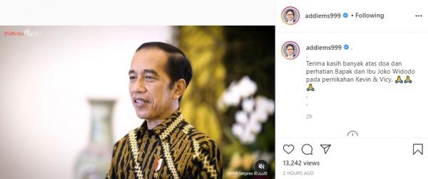 “Terima kasih banyak atas doa dan perhatian Bapak dan Ibu Joko Widodo pada pernikahan Kevin dan Vicy,” tulis Addie MS di keterangan fotonya.