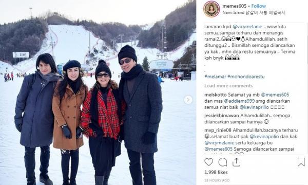 "Anakku @kevinaprilio seringkali membuat surprise utk aku dan mas @addiems999 , kali ini saat kita sedang berkumpul dg teman2 dari @mostviralproject, tiba2 dia menyatakan lamaran kpd @vicymelanie. wow kita semua, sampai terharu dan menangis ramai2. Alhamdulillah, setlh ditunggu2," tulis Memes seraya memohon doa agar rencana Kevin dan Vicy diberi kelancaran.