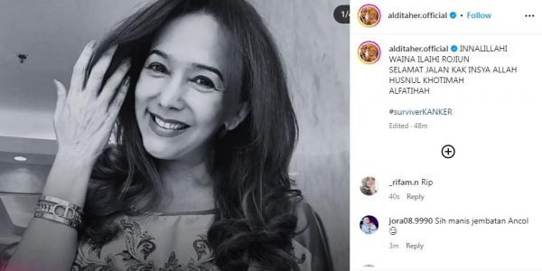 "Innalillahi Waina Ilaihi Rojiun. Selamat Jalan Kak Insya Allah Husnul Khotimah. Al-fatihah," bunyi caption yang dibubuhkan Aldi dalam unggahan hitam putih Kiki Fatmala.
