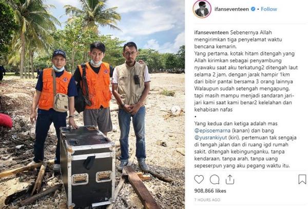 Dia mengatakan, ada tiga penyelamat yang membuatnya selamat dan tetap hidup dari tragedi tersebut. "Sebenernya Allah mengirimkan tiga penyelamat waktu bencana kemarin," tulis Ifan, seperti dikutip dari keterangan di Instagram, Jumat (28/12/2018).