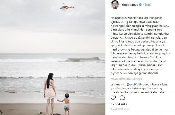 "Babak baru lagi nanganin Bjorka, sekarang tahapannya apa-apa udah ngerengek dan nangis, semingguan inilah," kata Ringgo yang dibeberkan melalui keterangan foto di Instagram miliknya, Selasa (26/6/2018).