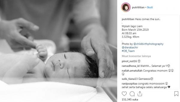 Kabar bahagia ini dibagikan melalui Instagram pribadinya. Putri Titian mengunggah foto bayinya dan menuliskan lengkap namanya.