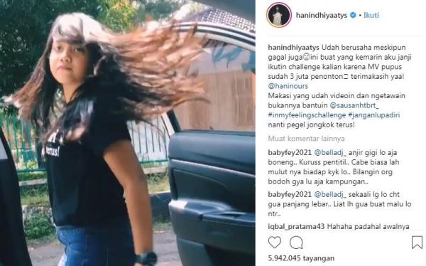 "Udah berusaha meskipun gagal juga. Ini buat yang kemarin aku janji ikutin challenge kalian karena MV pupus sudah 3 juta penonton. Terimakasih yaa!" tulis Hanin, seperti dikutip dari akun Instagram miliknya @hanindhiyaatys, Selasa (31/7/2018).