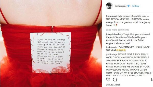 "My version of a white rose — THE APOCALYPSE WILL BLOSSOM — an excerpt from the greatest of all time, jenny holzer," tulis Lorde di akun Instagramnya melalui keterangan foto gaun merah yang diunggah, Senin (29/1/2018).